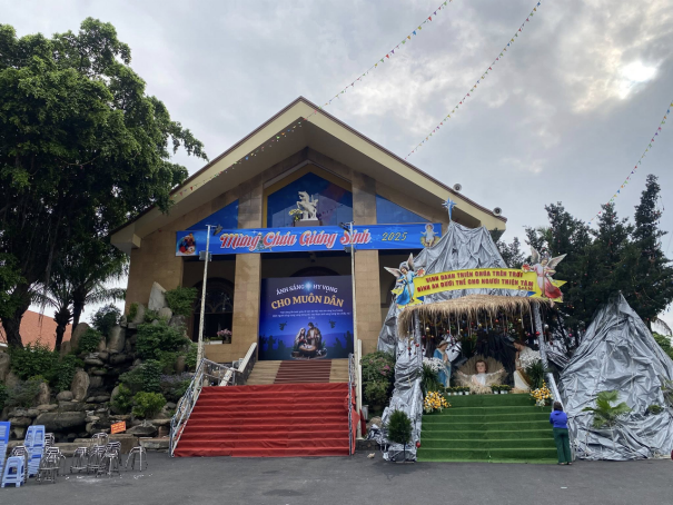 Nhà thờ có hồ nước trước cổng - nét hiếm thấy tại giáo phận Sài Gòn. Mùa Giáng Sinh, hồ nước được trang hoàng với tiểu cảnh cây thông bạc, số 2025, chữ Noel…