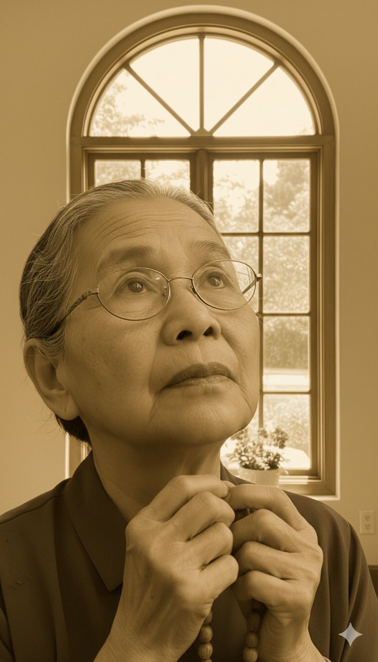 Bà không chỉ cầu nguyện khi vui, mà ngay cả lúc đối diện với nỗi đau và thử thách - khi chồng thờ ơ, con cái ngang tàng không chịu nghe lời, cuộc sống bấp bênh - bà vẫn cầm tràng chuỗi, thinh lặng cầu nguyện.