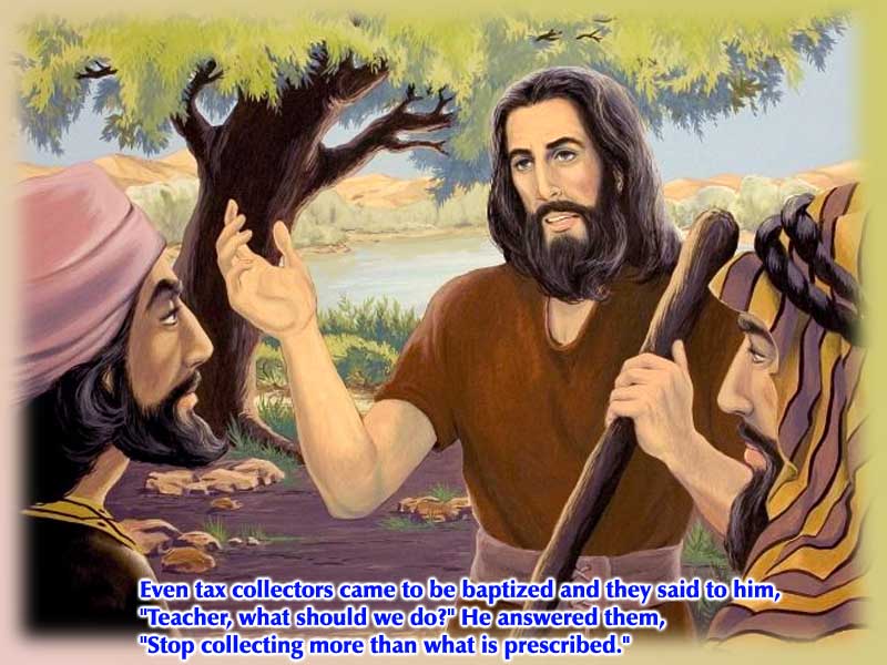 Đối với người thu thuế thì ngài dạy họ đừng bắt chẹt ai: "Đừng đòi hỏi gì quá mức đã ấn định cho các anh." (Lc 3,13)