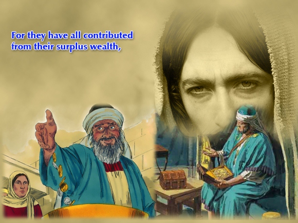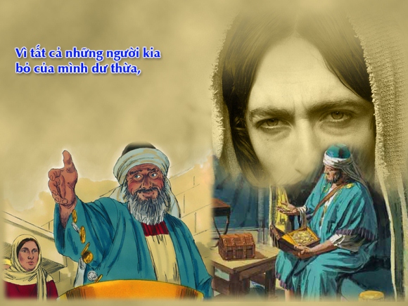 Chúa dạy một bài học thật lớn, thật ý nghĩa. Làm việc, dâng cúng, trao tặng mà không có tấm lòng, dâng cúng nhiều để khoe khoang, để ghi sổ vàng nhưng tấm lòng lại khô cứng, của cải thì chưa đụng tới cả cái sản nghiệp to lớn, dâng cúng, trao tặng mới như như hạt cát. Chúa không tán dương những hạng người này. Người nghèo thật nhiều đang ở chung quanh chúng ta. Người đau khổ, bơ vơ vất vưởng đang ở xung quanh chúng ta. Liệu có ai biết ghi ơn họ khi họ dâng cúng, trao tặng những món tiền nhỏ nhoi, nhưng là những đồng tiền mồ hôi nước mắt của họ.