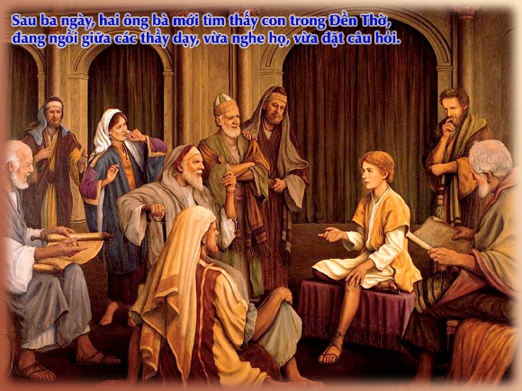 Suy niệm: Đời sống gia đình của thánh gia thất dù rất ấm êm hoà thuận vẫn xảy ra sự cố: Có mỗi một người con, mới mười hai tuổi, dẫn lên đền thờ Giê-ru-sa-lem chầu lễ mà cũng để đi lạc. Thực ra, Đức Ma-ri-a và Thánh Cả Giu-se không phải là những phụ huynh vụng về thiếu trách nhiệm trong việc chăm sóc cho con cái. Là bậc làm cha mẹ, hai ngài có bổn phận nhận ra ý định của Thiên Chúa nơi Giê-su con mình. Mà chương trình của Thiên Chúa luôn đi bước trước và các ngài phải nỗ lực để theo kịp những đòi hỏi của Thánh ý Thiên Chúa. Các ngài đã nhận ra rằng ngay cả Con Thiên Chúa làm người cũng phải luôn tìm biết thánh ý Chúa để tuân hành: “Cha mẹ không biết là con có bổn phận ở nhà Cha con sao ?”