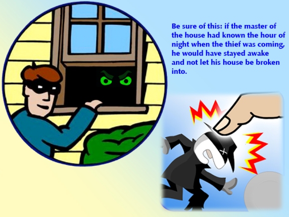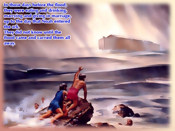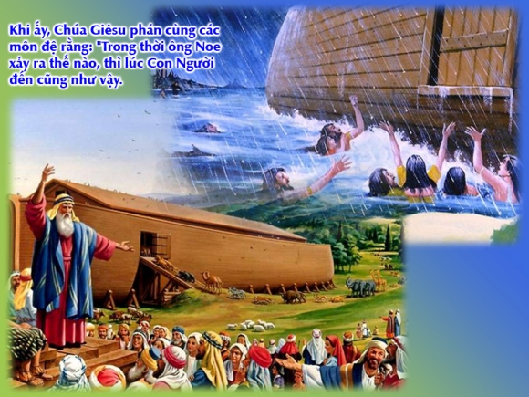 Tỉnh thức để không bị nước đại hồng thủy cuốn trôi và vùi dập tất cả như con người thời ông No-e trước hồng thủy vẫn ăn chơi trác táng, đắm chìm trong tội lỗi, không hay không biết, đến nỗi khi gia đình ông No-e đã vào tầu thì mọi việc đã quá muộn đối với tất cả mọi người.