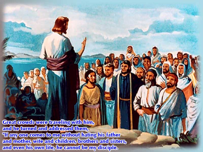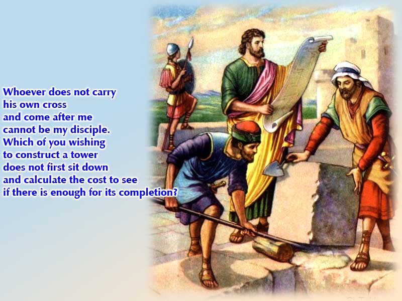 Lời Chúa Giêsu căn dặn các môn đệ được Phúc Âm Luca đặt trong một khung cảnh thật ý nghĩa: “Có rất đông người cùng đi đường với Đức Giêsu”. Hiển nhiên, không phải cứ cùng đi đường với Đức Giêsu mà đã là môn đệ của Ngài, mà còn phải “từ bỏ hết những gì mình có” và “vác thập giá mình theo Chúa”. Nếu chỉ làm phúc bố thí, hoạt động công tác xã hội, nếu chỉ đi lễ, đọc kinh… mà chưa xoá bỏ dấu ấn của cái tôi (từ bỏ ý riêng mình) và đóng lên những công việc đó dấu ấn của Đức Kitô (vác thập giá mình mỗi ngày), thì những việc đó chưa phải là việc của người môn đệ Chúa.