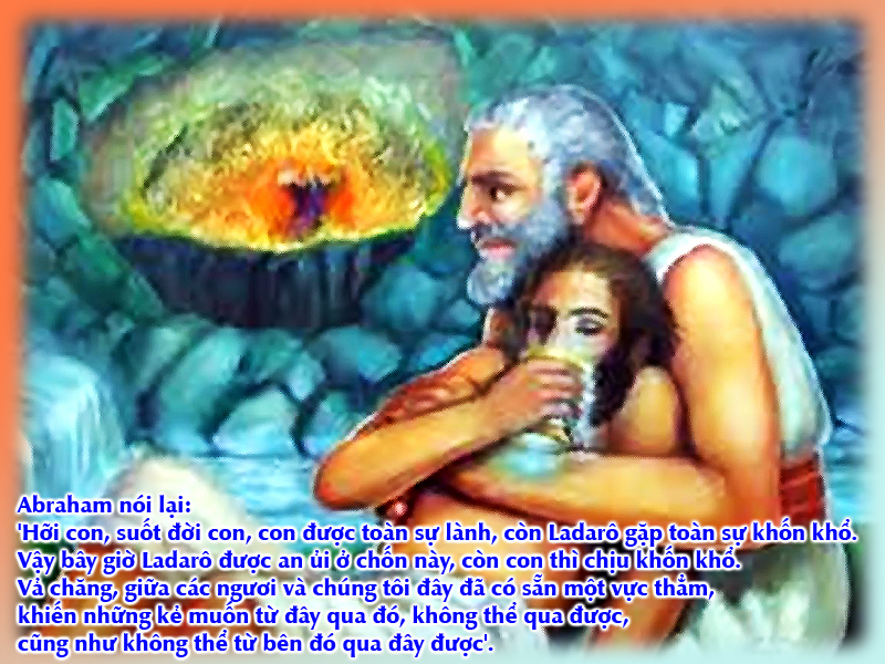 'Con ơi, hãy nhớ lại: suốt đời con, con đã nhận phần phước của con rồi; còn La-da-rô suốt một đời chịu toàn những bất hạnh. Bây giờ, La-da-rô được an ủi nơi đây, còn con thì phải chịu khốn khổ.'