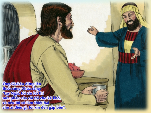 Theo cách nhìn của những người thời ấy thì ông là một người tội lỗi. Trong khi mọi người tránh xa những hạng người như thế, thì Đức Giêsu lại “vào trọ” nhà ông. Ông vô cùng kinh ngạc và xúc động vì thái độ thân thiện khác thường này. Từ kinh ngạc đến cảm phục, ông đã thay đổi hẳn cuộc sống.