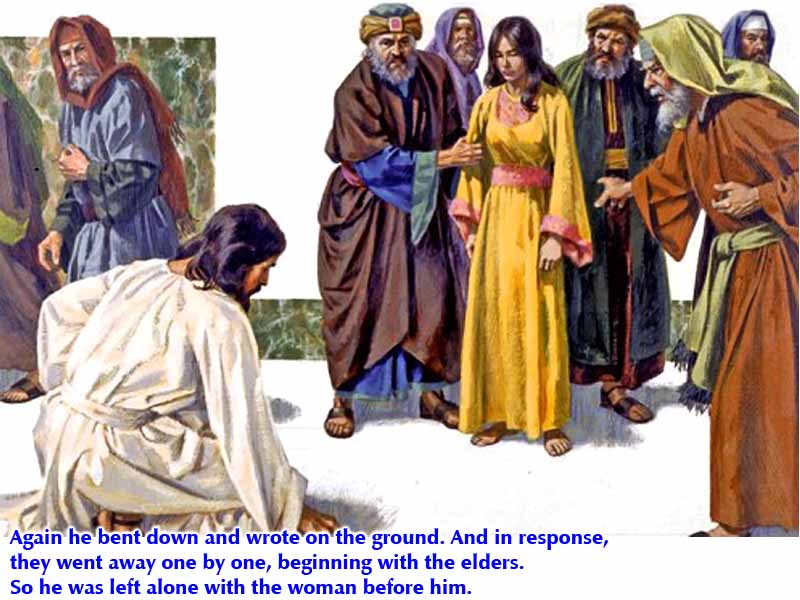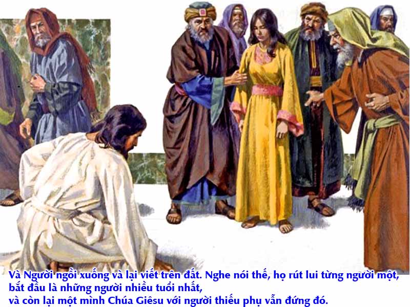 Đức Giêsu nói: “Tôi cũng vậy, tôi không lên án chị đâu! Thôi chị cứ về đi, và từ nay đừng phạm tội nữa!”