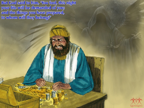 Rất nhiều con người ngày hôm nay sống trong sợ hãi. Hầu như nỗi sợ hãi ngày càng tăng cho dù người ta có ý thức hay không, và nỗi sợ hãi được biểu lộ dưới nhiều hình thức. Người giầu có trong dụ ngôn hôm nay là một điển hình cho sự sợ hãi ấy: ông chẳng nghĩ tới ai ngoài mình và tìm cách che lấp nỗi sợ bằng việc thu tích của cải. Nhưng ông không biết rằng cả cái mà ông đang cậy dựa vào cũng sẽ rời bỏ ông. Chỉ có một cái sẽ không hề rời bỏ ông, đó là cái chết. Cái chết là một thực tại gắn liền với hiện hữu con người như hình với bóng. Khi chết, con người buông tay trước tất cả. Như thế, làm việc, kiếm tiền rồi ra sao? Đâu là ý nghĩa của việc làm? Đâu là kho tàng thực sự của con người?