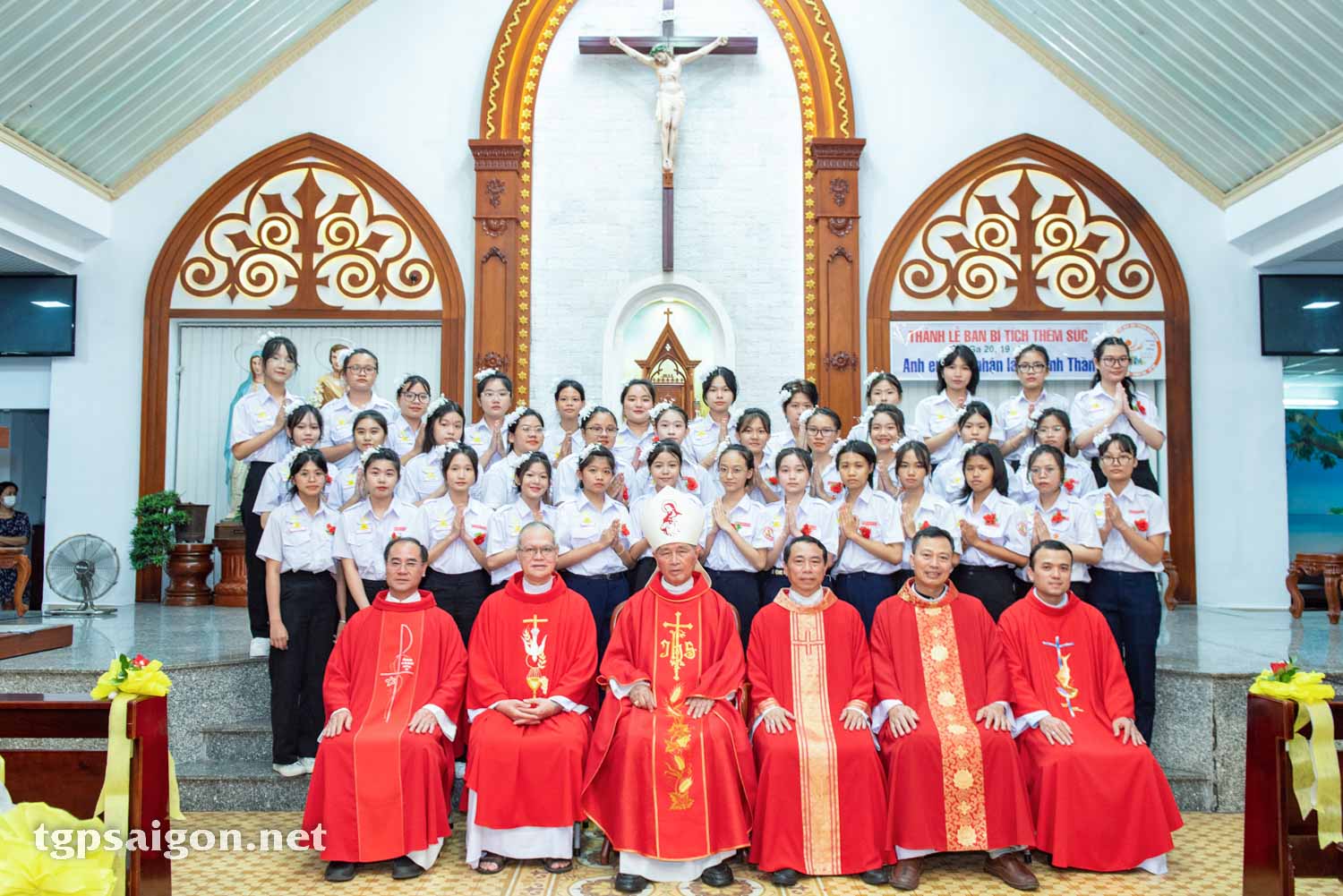 Kết thúc thánh lễ ĐGM và quý cha chụp hình lưu niệm với các em lãnh nhận Bí tích Thêm Sức. Cầu chúc cho các em với ơn thần trí Khôn Ngoan và Thông Hiểu, Thần trí Lo Liệu và Sức Mạnh, thần trí Suy Biết và Đạo Đức, cùng ơn Kính Sợ Chúa; các em luôn vững vàng trong đức tin, bền đỗ trong đức ái và can đảm làm chứng cho Chúa Kitô trong cuộc sống hằng ngày.