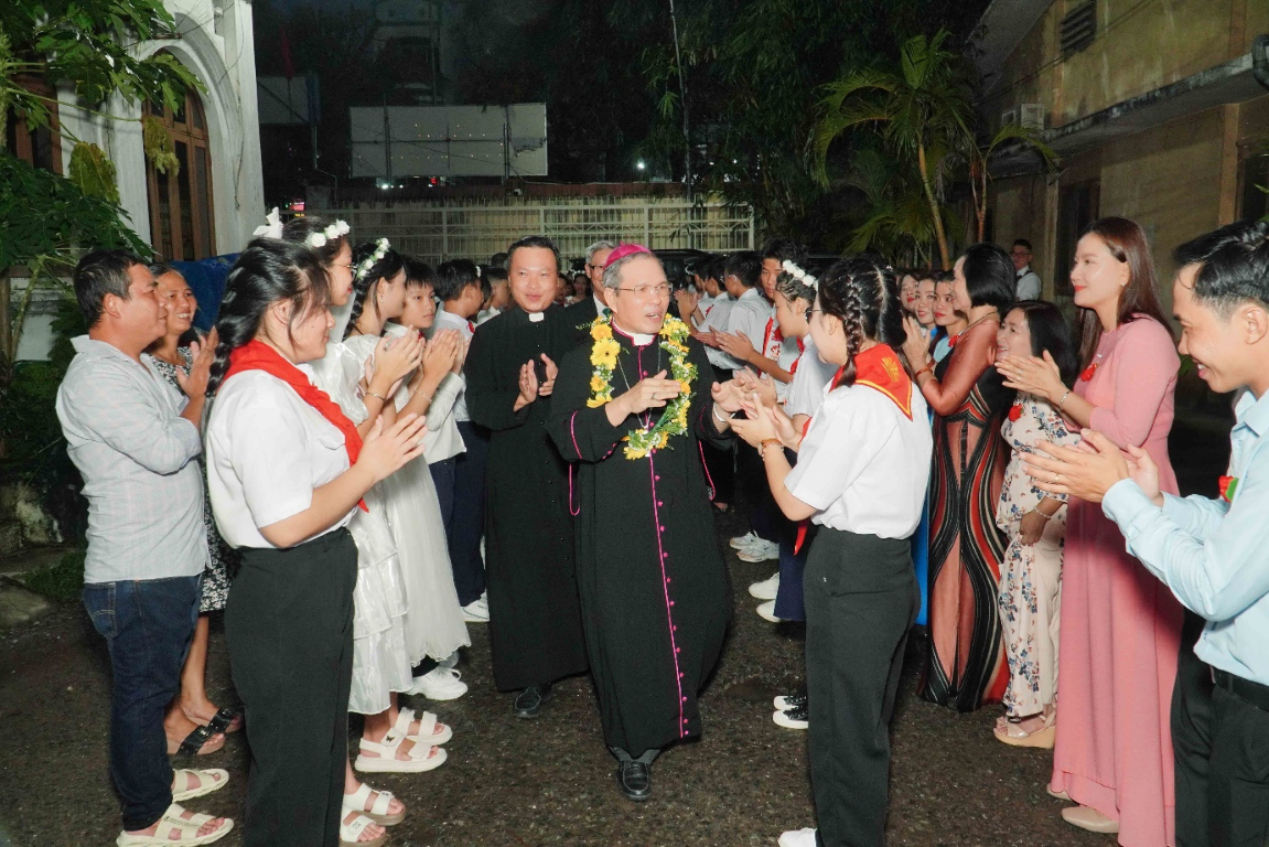 Trước đó, lúc 17g30, Lm chánh xứ Giuse cùng HĐMV giáo xứ, các đoàn thể và các em thiếu nhi có mặt tại cổng để chào đón ĐGM Giuse cùng quý cha đồng tế.