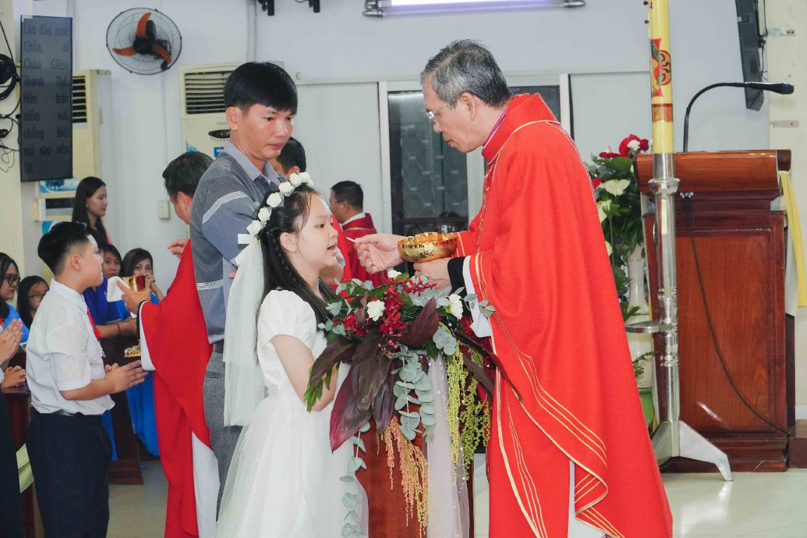 Trong phần rước lễ, ĐGM trao Mình Máu Thánh Chúa cho các em Rước Lễ lần đầu và phụ huynh trước bàn quỳ trang trọng. Cha chánh xứ trao Mình Máu Thánh Chúa cho các em lãnh BTTS và người đỡ đầu.