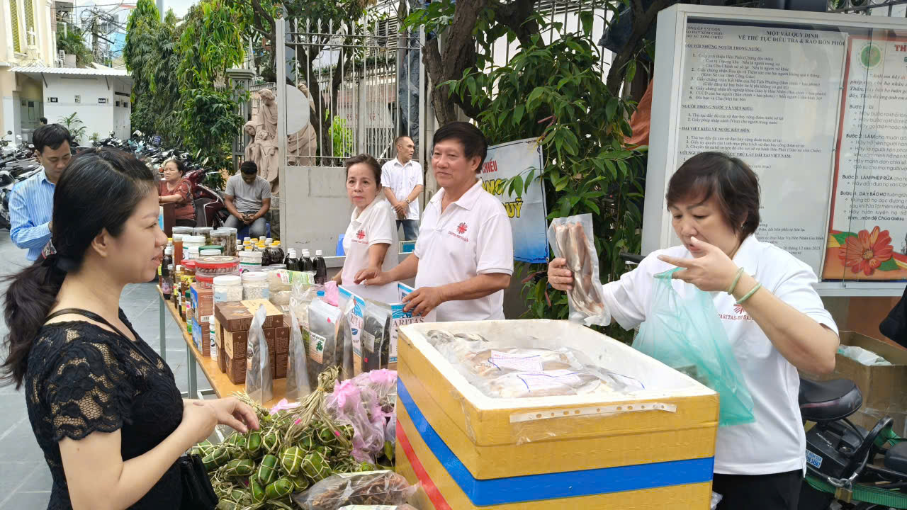 Ngay sau Thánh lễ, nhiều giáo dân nán lại để ghé thăm các gian hàng gây quỹ bác ái do Caritas Hạt Xóm Chiếu tổ chức. Những gian hàng tuy đơn sơ nhưng được chuẩn bị chu đáo, đã nhận được sự quan tâm và ủng hộ nhiệt tình của cộng đoàn.
