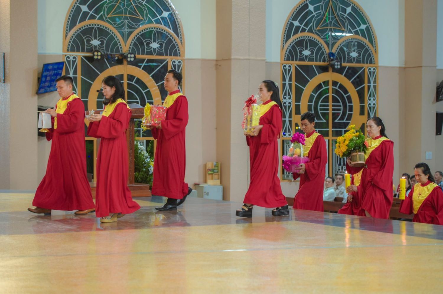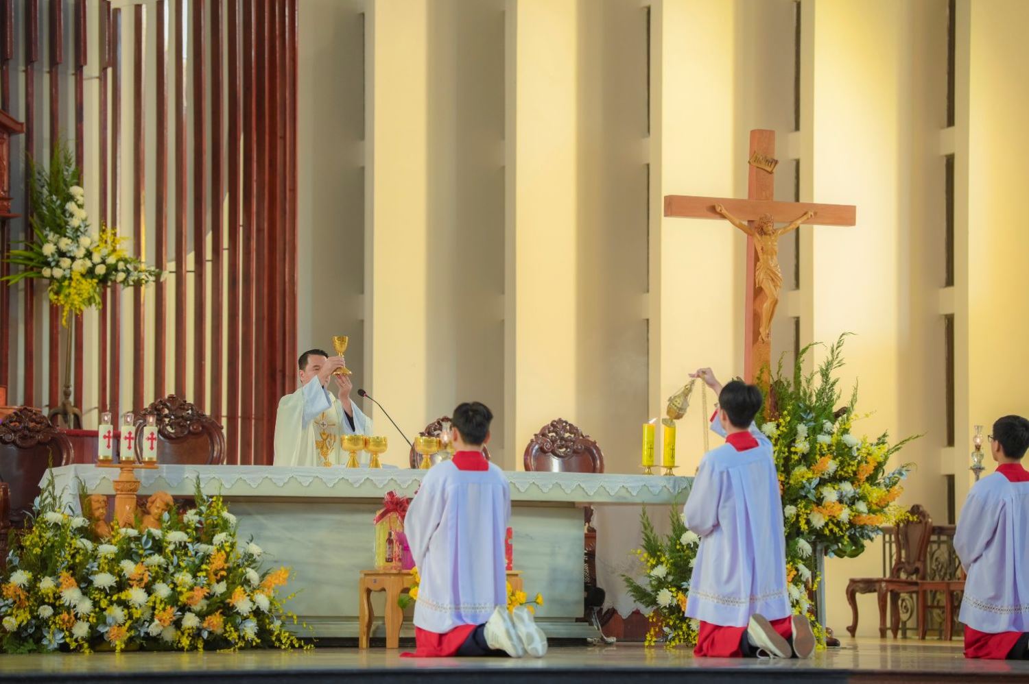 Thánh lễ do linh mục (Lm) phó Vinh Sơn Nguyễn Quốc Viễn chủ tế. Hiệp dâng Thánh lễ có các tu sĩ nam nữ, các thành viên ca đoàn Hiển Linh qua nhiều thế hệ, cùng đông đảo cộng đoàn dân Chúa trong bầu khí sốt sắng và hiệp thông.