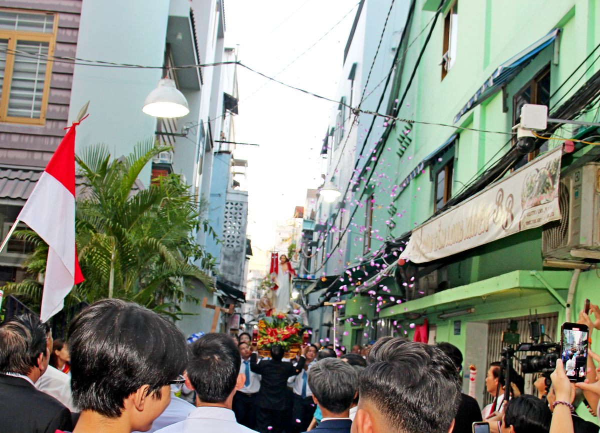 Trên đây là lời bài hát trong suốt hành trình cuộc rước kiệu Chúa Phục Sinh vào lúc 17g15 ngày 20-4-2025, đi từ giáo khu Giuse, giáo khu Thánh Thể, giáo khu Phaolô ra kênh Nhiêu Lộc vào cổng chính nhà thờ. Đoàn rước thật hoành tráng và ấn tượng trong niềm hân hoan của cả cộng đoàn giáo xứ, có Linh mục (Lm) chánh xứ Giuse Lê Ngọc Đa và hai Linh mục phó Giuse Nguyễn Trọng Tín và Lm Phanxico Assisi Đinh Hồng Phúc CRM cùng đồng hành.