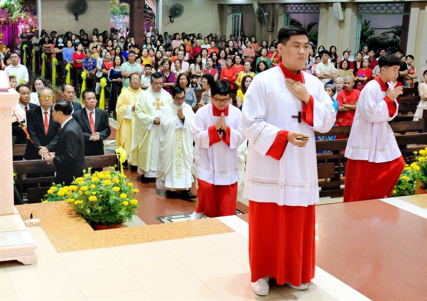 Trước khi Thánh lễ bắt đầu, đoàn rước với Thánh Giá nến cao từ khuôn viên nhà thờ tiến vào cung thánh trong tiếng hát của bài ca nhập lễ “Đoàn con hân hoan về đây phút giây giao thừa, hiệp chung câu ca dâng lời tạ ơn Thiên Chúa. Một năm trôi qua chan chứa muôn hồng ân Cha. Tình yêu bao la cao ngất hơn ngàn non xa...” Nhà thờ rực rỡ ánh sáng, được trang trí với những sắc màu Tết truyền thống tạo nên một không gian vừa gần gũi, vừa linh thiêng.