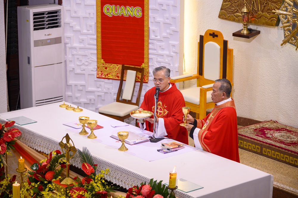 Thánh lễ do linh mục phó xứ Gioan Baotixita Đỗ Quốc Vinh chủ tế. Đồng tế với ngài có linh mục chánh xứ Phêrô, cùng với sự tham dự đông đảo của các tu sĩ, các thành viên tân - cựu Hội đồng Mục vụ và cộng đoàn dân Chúa trong giáo xứ.