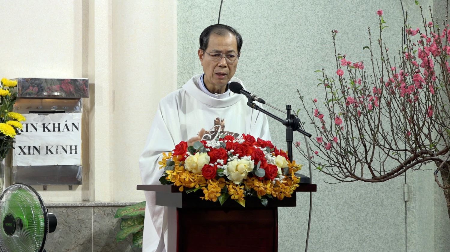 Đáp từ, Linh mục chánh xứ gửi lời chúc năm mới bình an, sức khỏe và hạnh phúc đến từng gia đình, đồng thời mời gọi cộng đoàn tiếp tục đem ánh sáng Lời Chúa đến cho mọi người, để tất cả cùng được hưởng ơn cứu độ.