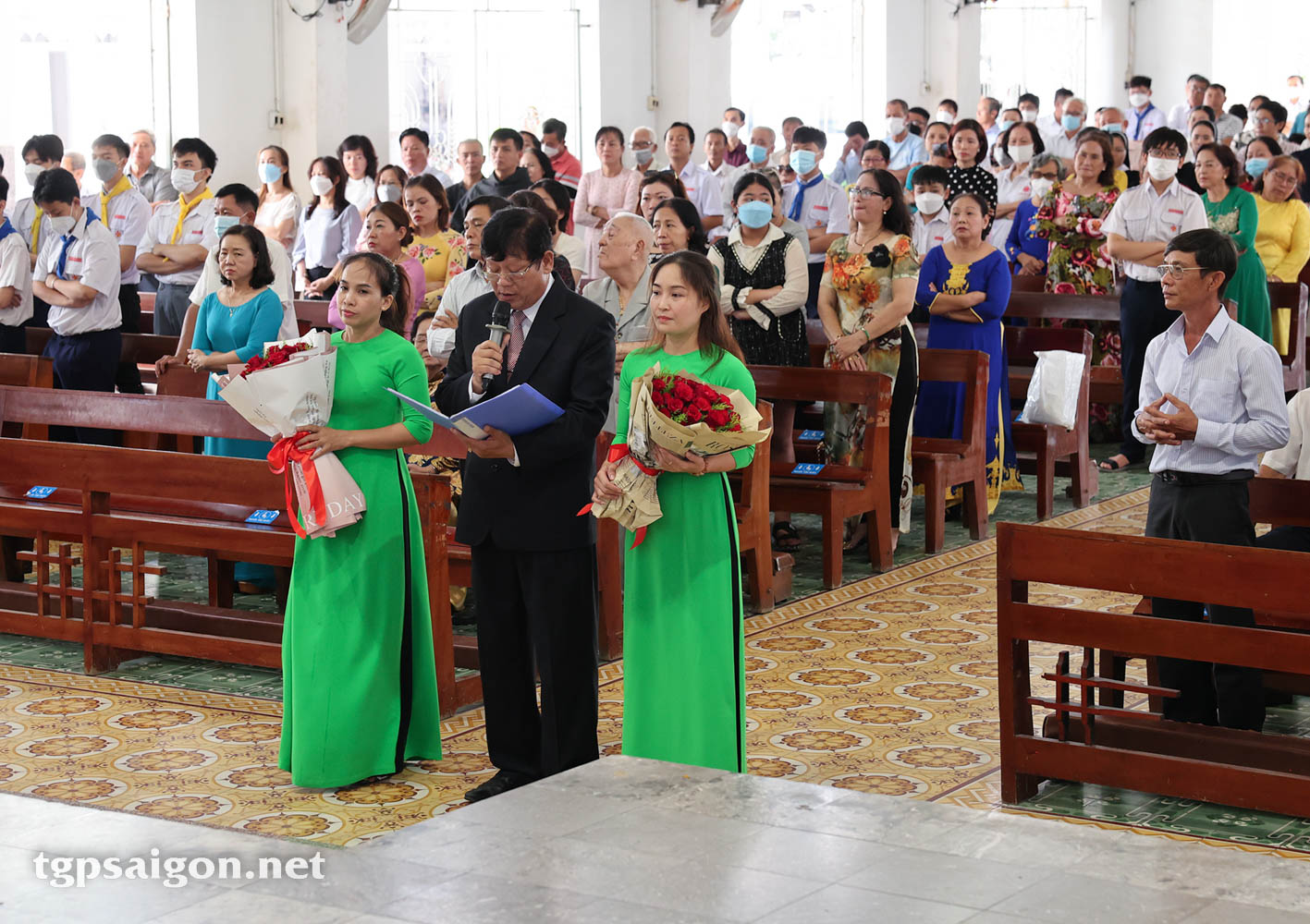 Sau đó, hai đại diện kính dâng lên Lm đại diện GM và Lm Tân Chánh xứ những bó hoa tươi thắm thể hiện tâm tình tri ân của cộng đoàn giáo xứ.