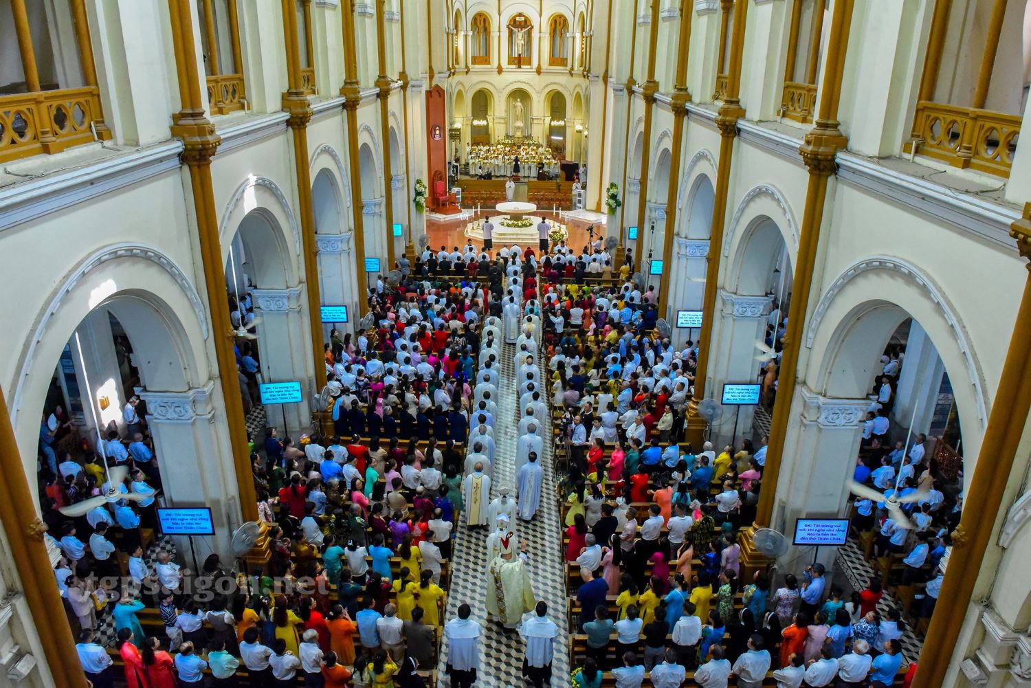 Thánh lễ khởi sự với đoàn rước đồng tế từ cuối nhà thờ tiến lên cung thánh.