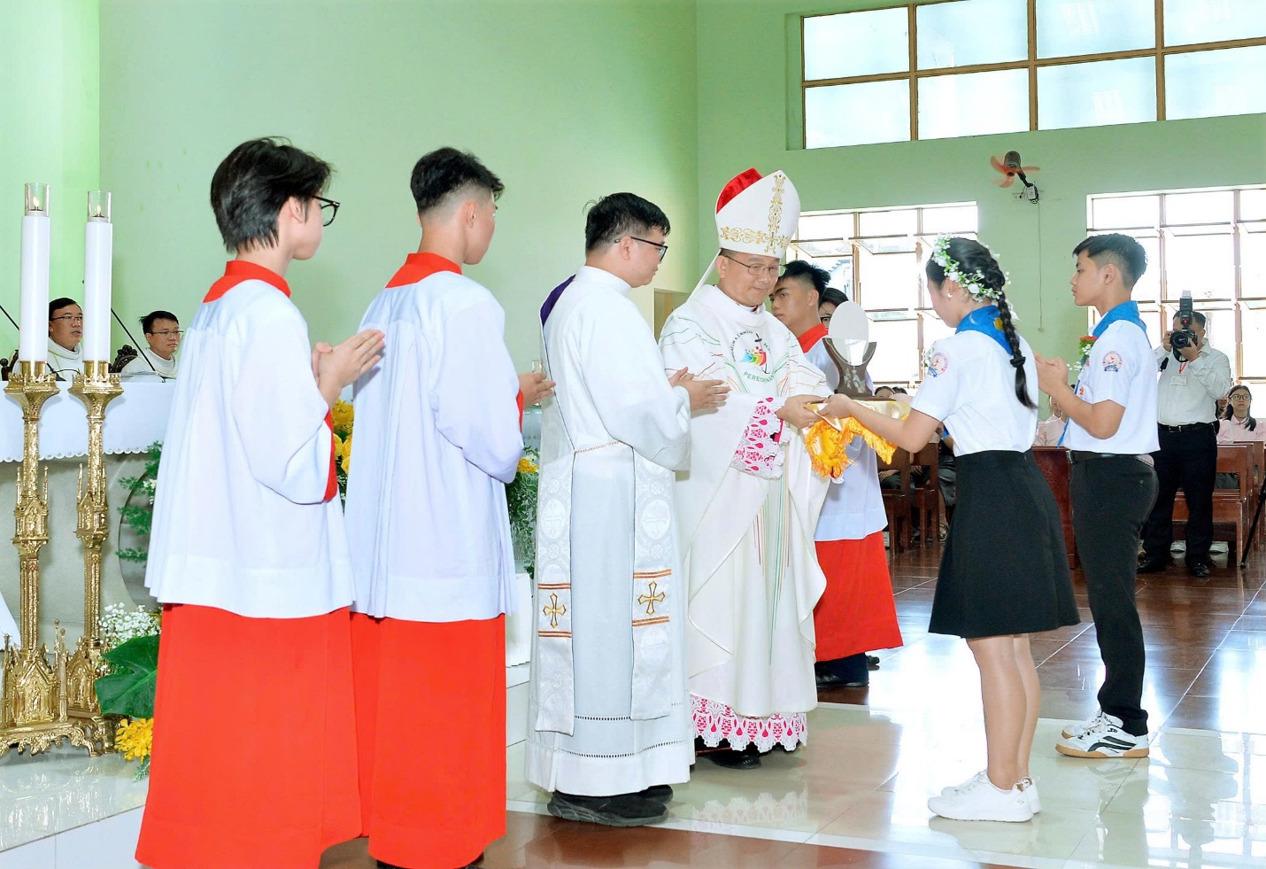 Khởi đầu Thánh lễ là đoàn rước với Thánh giá nến cao dẫn đầu, các em được lãnh nhận Bí tích Thêm Sức, rước lễ lần đầu, cuối cùng là Đức Cha chủ tế. Đồng tế với Đức Cha là linh mục (Lm) Hạt trưởng Vinh Sơn, Lm Chánh xứ Gioan Baotixita, Lm Phó xứ Giuse, các tu sĩ cùng giáo dân trong xứ và ngoài xứ