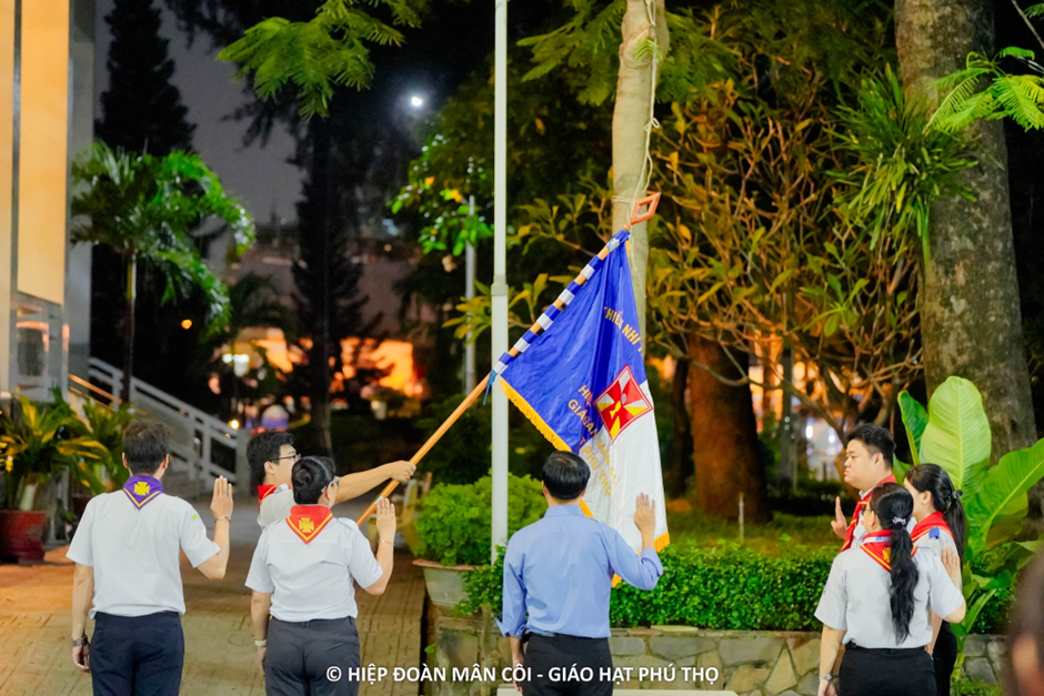 Tiếp đó, các dự trưởng tham dự nghi thức chào cờ Thiếu Nhi Thánh Thể ngoài sân, đánh dấu khoảnh khắc khai giảng chính thức. Trong nghi thức, mỗi dự trưởng được nhắc nhớ về căn tính và sứ mạng: sống kỷ luật, yêu thương và sẵn sàng dấn thân phục vụ.