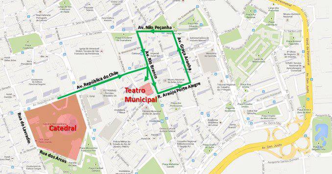 Lúc 5 giờ chiều, đoàn rước Đức Thánh Cha đi dọc theo các đại lộ Avenida República do Chile, Avenida Rio Branco, Rua Araújo Porto Alegre, Avenida Graça Aranha, Nile Avenue và về Avenida Rio Branco để vào Nhà hát thành phố (Theatro Municipal)