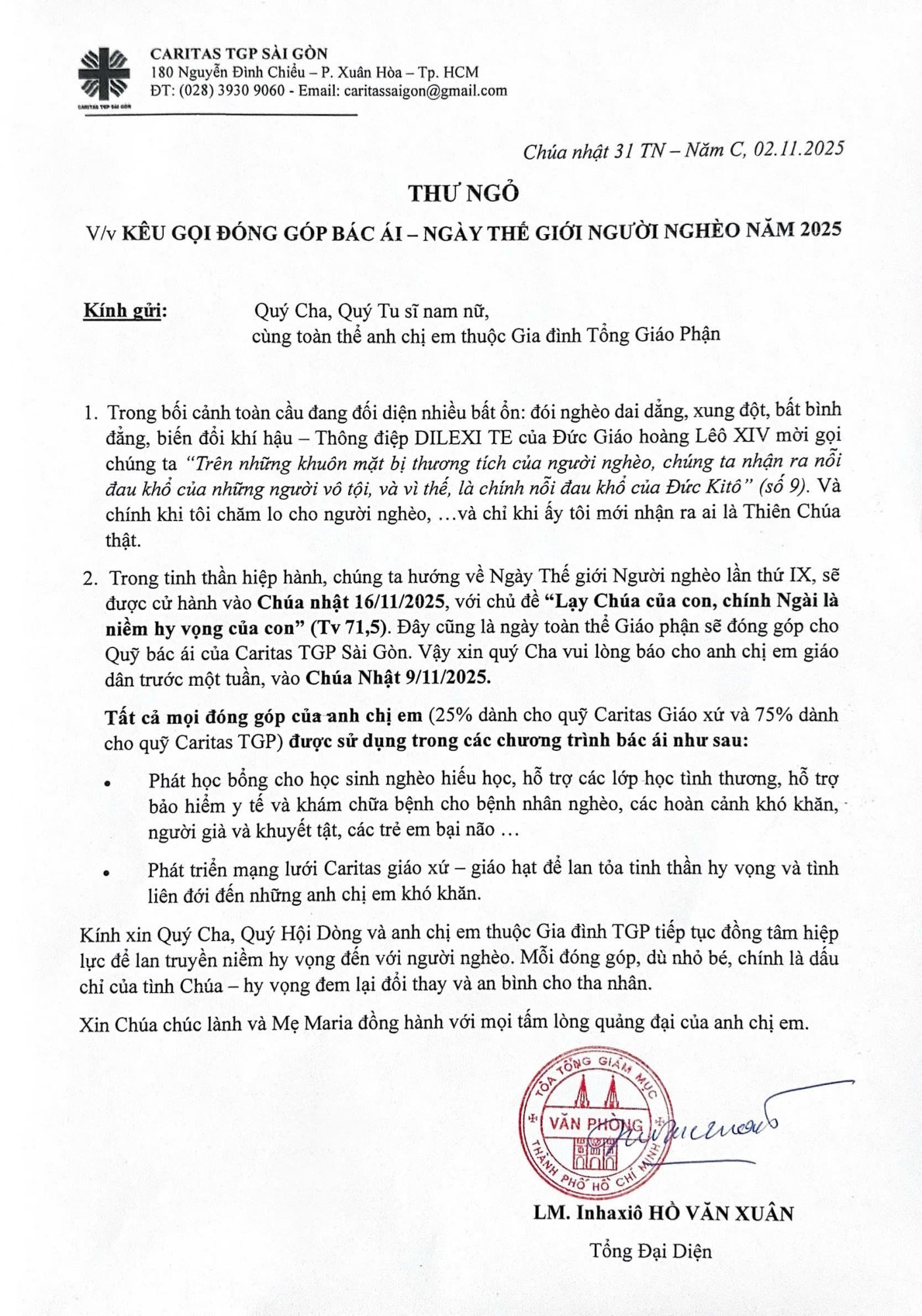 2. Trong tinh thần hiệp hành, chúng ta hướng về Ngày Thế giới Người nghèo lần thứ IX, sẽ được cử hành vào Chúa nhật 16/11/2025, với chủ đề “Lạy Chúa của con, chính Ngài là niềm hy vọng của con” (Tv 71,5). Đây cũng là ngày toàn thể Giáo phận sẽ đóng góp cho Quỹ bác ái của Caritas TGP Sài Gòn. Vậy xin quý Cha vui lòng báo cho anh chị em giáo dân trước một tuần, vào Chúa Nhật 9/11/2025.