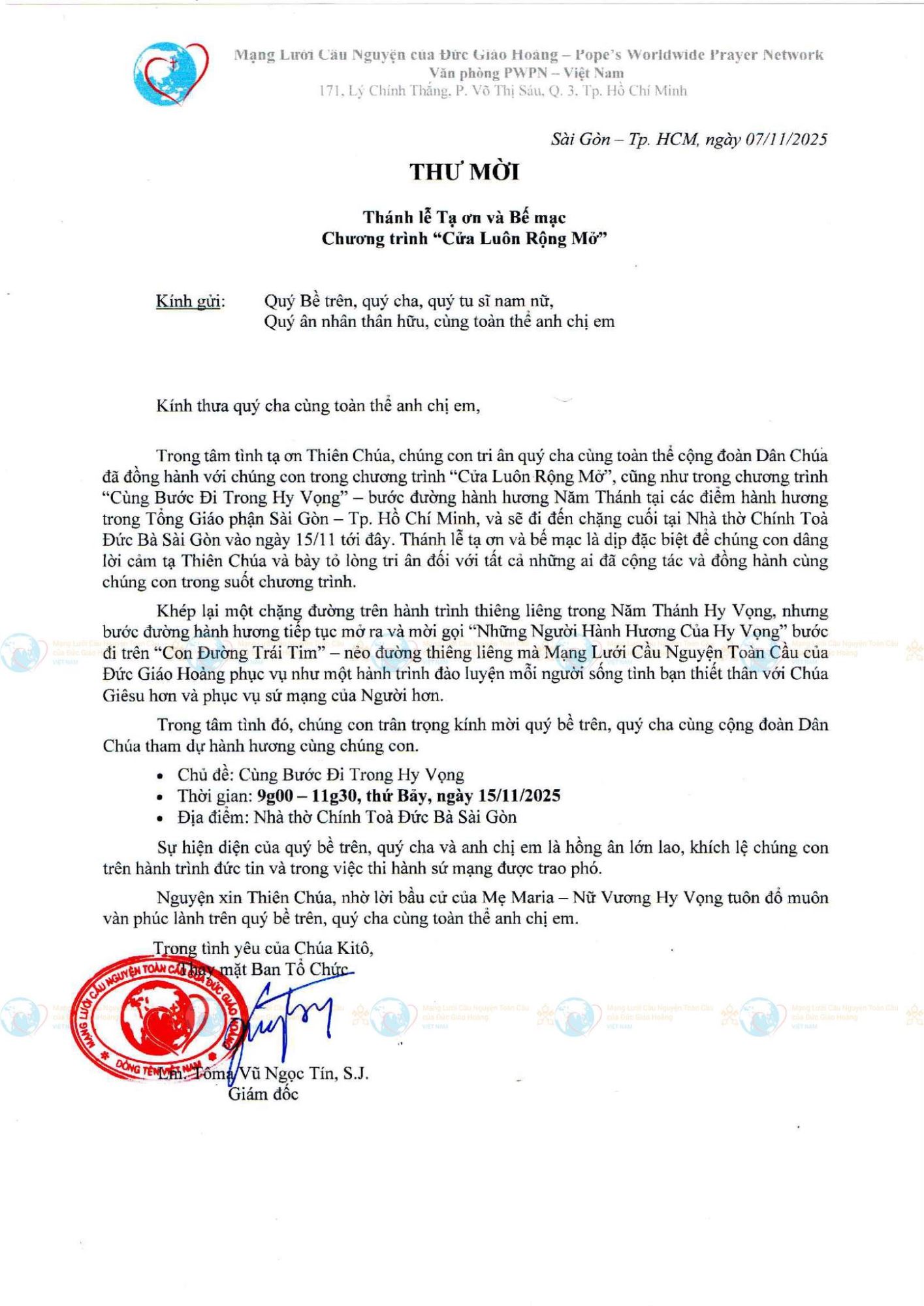 Trong tâm tình tạ ơn Thiên Chúa, chúng con tri ân quý cha cùng toàn thể cộng đoàn Dân Chúa đã đồng hành với chúng con trong chương trình “Cửa Luôn Rộng Mở”, cũng như trong chương trình “Cùng Bước Đi Trong Hy Vọng” – bước đường hành hương Năm Thánh tại các điểm hành hương trong Tổng Giáo phận Sài Gòn, và sẽ đi đến chặng cuối tại Nhà thờ Chính Toà Đức Bà Sài Gòn vào ngày 15/11 tới đây. Thánh lễ tạ ơn và bế mạc là dịp đặc biệt để chúng con dâng lời cảm tạ Thiên Chúa và bày tỏ lòng tri ân đối với tất cả những ai đã cộng tác và đồng hành cùng chúng con trong suốt chương trình.