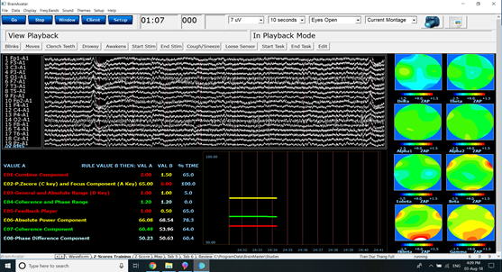 Kết quả chạy máy BrainMaster cho thấy bệnh nhân có rối loạn nhịp tim, huyết áp cao, khó khăn giấc ngủ, ngủ hay giật mình tỉnh giấc, thiếu oxy não, khó khăn kiểm soát vận động tay chân, khó khăn kiềm chế cảm xúc, khó khăn về ngôn ngữ diễn tả, khó khăn tiếp nhận, xử lý thông tin liên quan cảm xúc, vận động, ngôn ngữ, mối quan hệ không gian, hình ảnh.