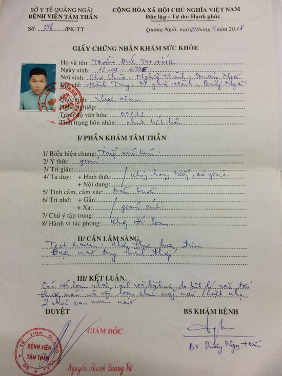 4.2 Trường hợp Trần Đức Thắng: Chẩn đoán: Rối loạn nhân cách, rối loạn hành vi ứng xử, tổn thương não, rối loạn chức năng não, liệt nửa người trái (phụ lục đính kèm) và được điều trị ở Bệnh viện Tâm Thần Quảng Ngãi. Theo chẩn đoán này ở Bệnh viện Tâm Thần Quảng Ngãi, bác sĩ trả về và nhắc người nhà chăm sóc cho em Thắng trong tình trạng nằm liệt như vậy suốt đời.