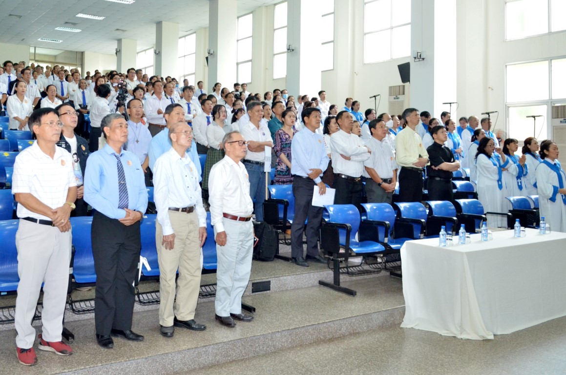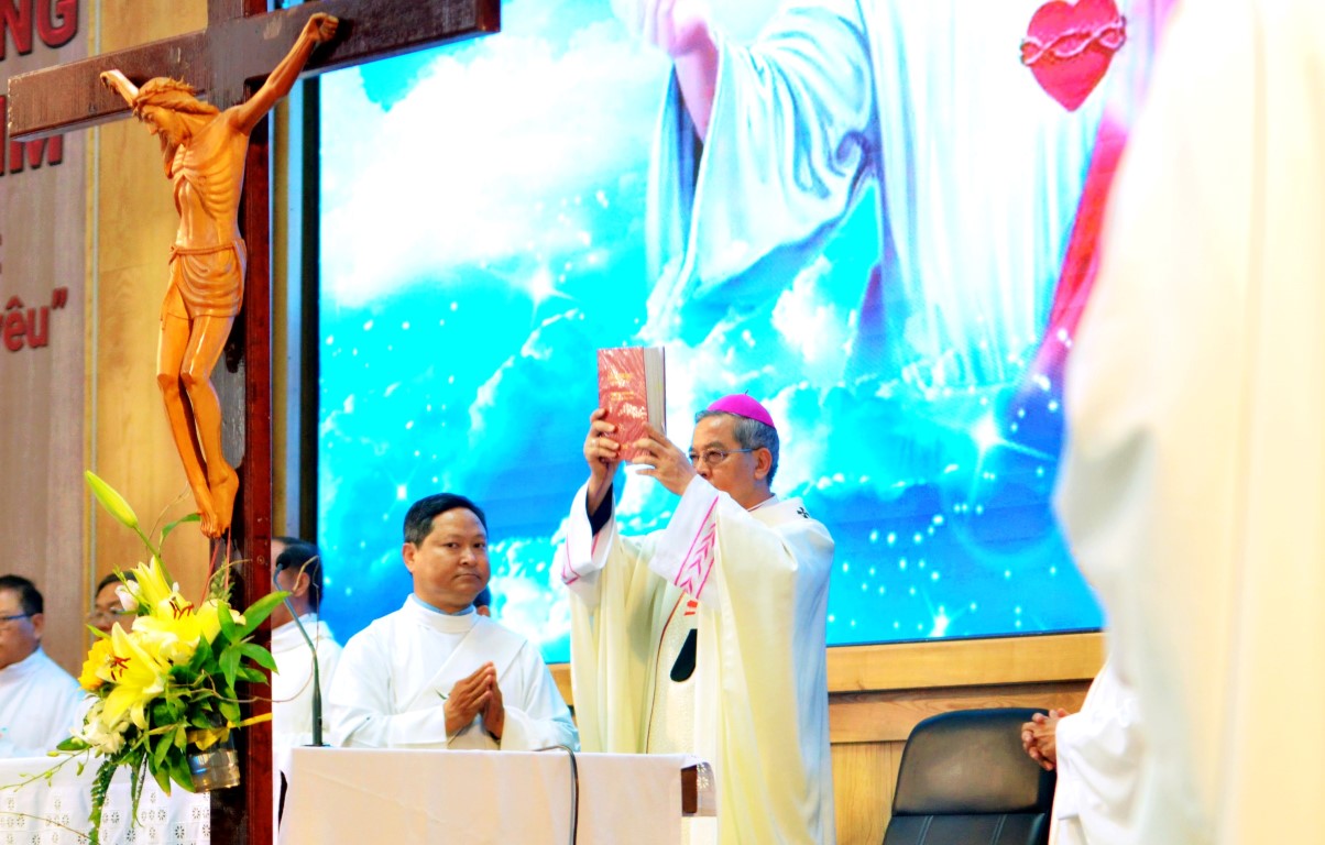 Lúc 9g, mọi người cùng đứng lên chào đón Đức TGM Giuse và lắng nghe huấn từ của ngài.