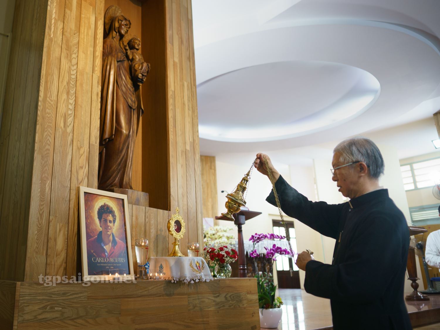 TGPSG (30.9.2025) – Vào lúc 9g00 sáng ngày 30.9.2025, trong bầu khí thánh thiêng và tràn đầy niềm vui, cộng đoàn dân Chúa quy tụ tại nhà nguyện Emmanuel, Trung tâm Mục vụ Tổng Giáo phận Sài Gòn (TTMV TGPSG), để tham dự Nghi thức đón nhận thánh tích của Thánh Carlo Acutis, vị thánh trẻ thuộc thế hệ thiên niên kỷ, người đã trở thành chứng nhân sống động cho lòng yêu mến Thánh Thể trong thời đại kỹ thuật số.