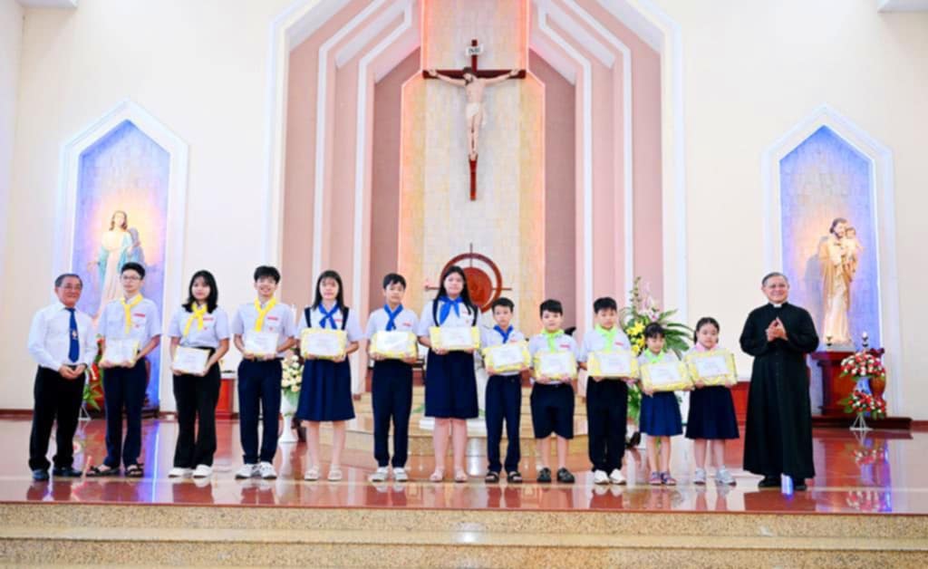 Sau đó, chị Anna Mai Diễm Phương - Đoàn phó Giáo lý viên - đã công bố danh sách 54 em thiếu nhi thuộc 12 lớp giáo lý được tuyên dương, nhận giấy khen cùng những phần quà khích lệ tinh thần học hỏi giáo lý. Trong đó có 36 em đạt giải nhất, nhì, ba và 18 em đạt giải khuyến khích.