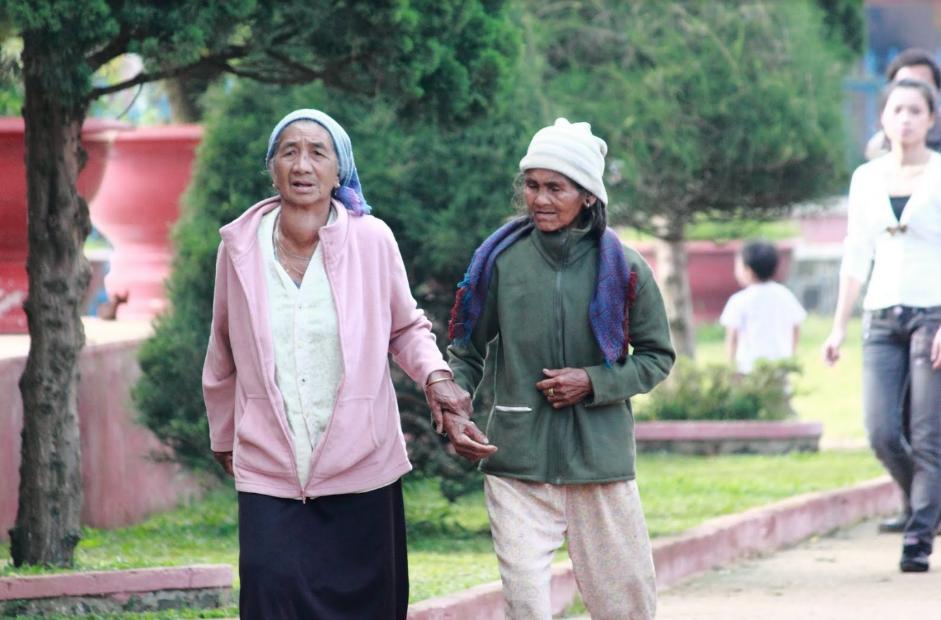 Ảnh: Hai bà cụ người S'Tiêng đi lễ sáng. Tác giả chụp tại nhà thờ Tân Rai, Lâm Đồng
