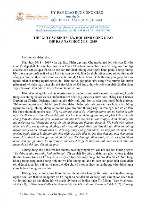 Uỷ ban Giáo dục Công giáo: Thư gửi các sinh viên, học sinh Công giáo dịp đầu năm học 2018-2019