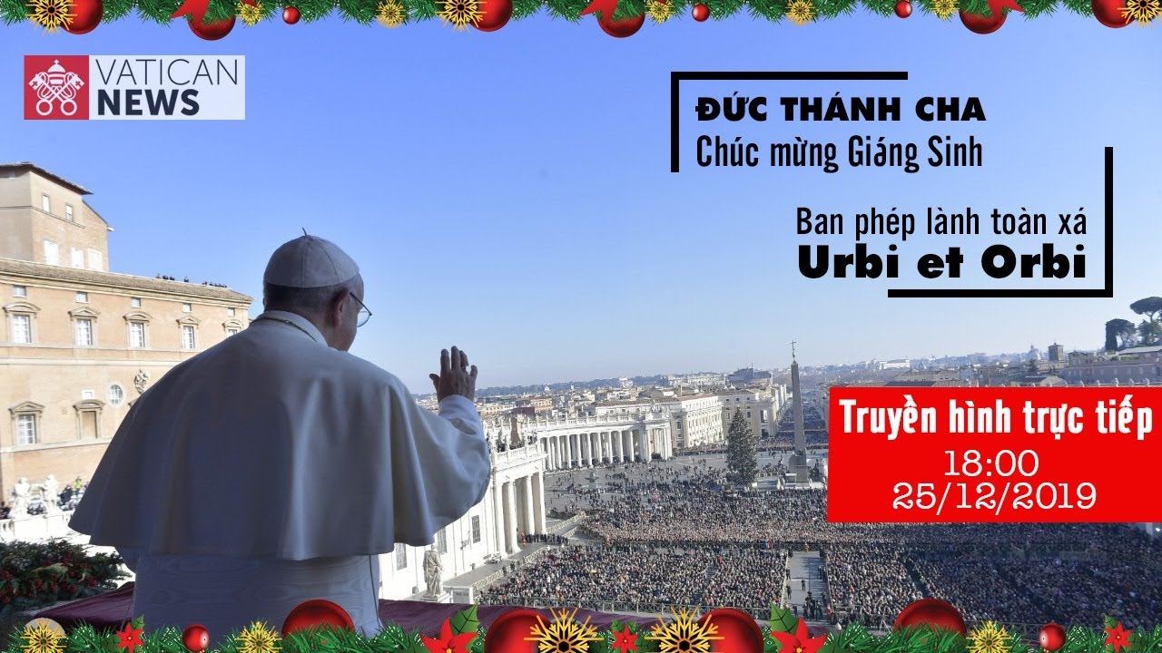 Vatican News Tiếng Việt sẽ truyền hình trực tiếp, với thuyết minh Tiếng Việt, Phép lành toàn xá Urbi et Orbi của Đức Thánh Cha Phanxicô trong ngày Lễ Giáng Sinh 25/12/2019, lúc 6 giờ chiều giờ Việt Nam