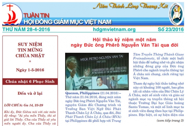 Tin Giáo hội Việt Nam 282930313233343536 Mừng Ngân khánh Giám mục Đức cha Phaolô Maria Cao Đình Thuyên Hội nghị thường niên Liên hiệp Bề trên Thượng cấp Việt Nam năm 2017 Tuần tin Hội đồng Giám mục Việt Nam số 52/2017 Uỷ ban Giáo dân: Gặp gỡ các Linh mục Trưởng ban Giáo dân của Giáo tỉnh Sài Gòn (lần thứ hai) Đại hội toàn quốc Tuyên Úy và Huynh trưởng TNTT Tuần tin Hội đồng Giám mục Việt Nam số 51/2017 Tuần tin Hội đồng Giám mục Việt Nam số 50/2017 Uỷ ban Giáo dân: Thư mời gặp gỡ (tháng 11/2017) Tìm Nét Riêng của Học viện Công giáo Việt Nam Tuần tin Hội đồng Giám mục Việt Nam số 49/2017 Thánh lễ bế mạc Đại hội 50 năm Cursillo Việt Nam Ủy Ban Thánh Nhạc: Hội thảo toàn quốc lần thứ 41 Tuần tin Hội đồng Giám mục Việt Nam số 48/2017 Đêm Thánh Ca: Nhờ Mẹ Maria đến với Chúa Giêsu Tiểu sử Đức Giám mục Luy Nguyễn Anh Tuấn Biên bản Hội nghị thường niên kỳ II-2017 Hội đồng Giám mục Việt Nam Hội đồng Giám mục Việt Nam đến thăm và tặng quà cho giáo dân tại giáo họ An Lộc, giáo xứ Chính toà, Thanh Hoá Tuần tin Hội đồng Giám mục Việt Nam số 47/2017 Thánh lễ an táng ĐGM Phanxicô Xaviê Nguyễn Văn Sang Chương trình tang lễ Đức cha Phanxicô Xaviê Nguyễn Văn Sang Tuần tin Hội đồng Giám mục Việt Nam số 46/2017 Tuần tin Hội đồng Giám mục Việt Nam số 45/2017 Uỷ ban Giáo dục Công giáo: Thư gửi các sinh viên, học sinh Công giáo dịp đầu năm học 2017-2018 Hội đồng Giám mục Việt Nam cứu trợ nạn nhân bão lụt tại giáo xứ Đông Yên và giáo xứ Quý Hòa Tuần tin Hội đồng Giám mục Việt Nam số 44/2017 Hội nghị Thường niên Uỷ ban Mục vụ Gia đình lần thứ VIII Họp mặt Liên Tu hội đời Việt Nam với Ban Điều hành Liên hiệp Tu hội đời Châu Á Uỷ ban Giáo dân: Gặp gỡ các Linh mục Trưởng ban Giáo dân của hai Giáo tỉnh Huế và Hà Nội Học viện Công giáo: Khai giảng năm học 2017-2018 Uỷ ban Giáo dân: Gặp gỡ các Linh mục Trưởng ban Giáo dân của Giáo tỉnh Sài Gòn 282930313233343536